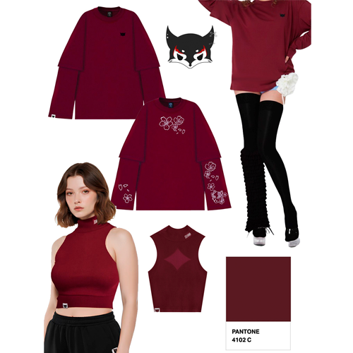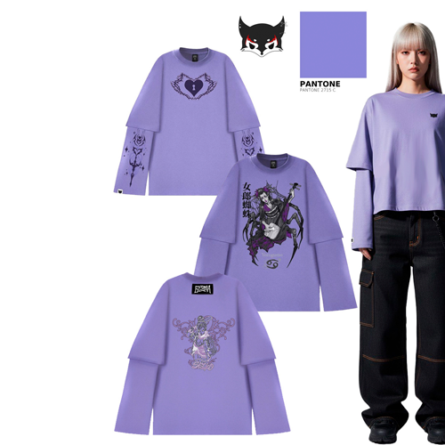 В коллекции он воплощён в многослойных лонгсливах с арт-графикой. Сиреневый фон становится пространством для персонажей японских легенд — магических и опасно прекрасных.
