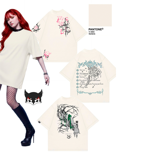 В коллекции БЕЗДНА этот цвет раскрывается через объёмные оверсайз-футболки с графикой в японском стиле — символами силы и мифа. Бело-кремовая база становится холстом для выразительных линий, создавая баланс между спокойствием и бездной.
